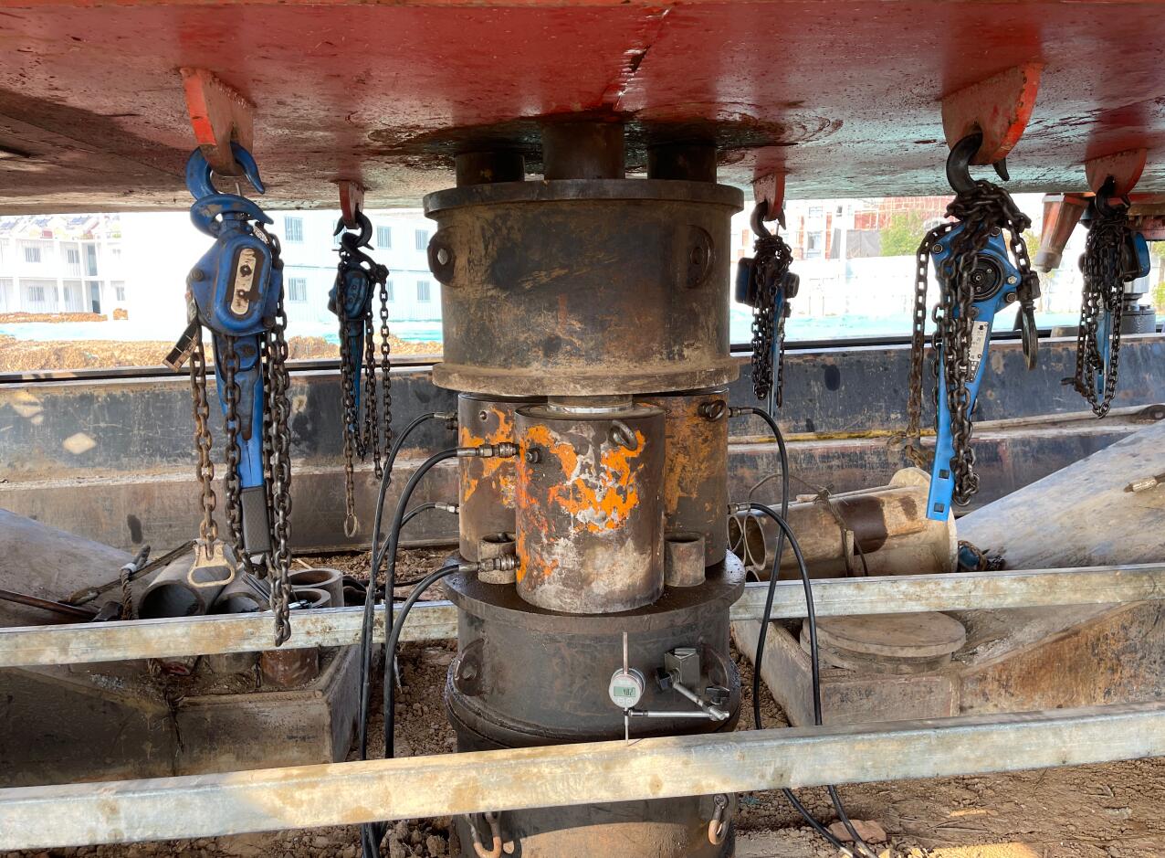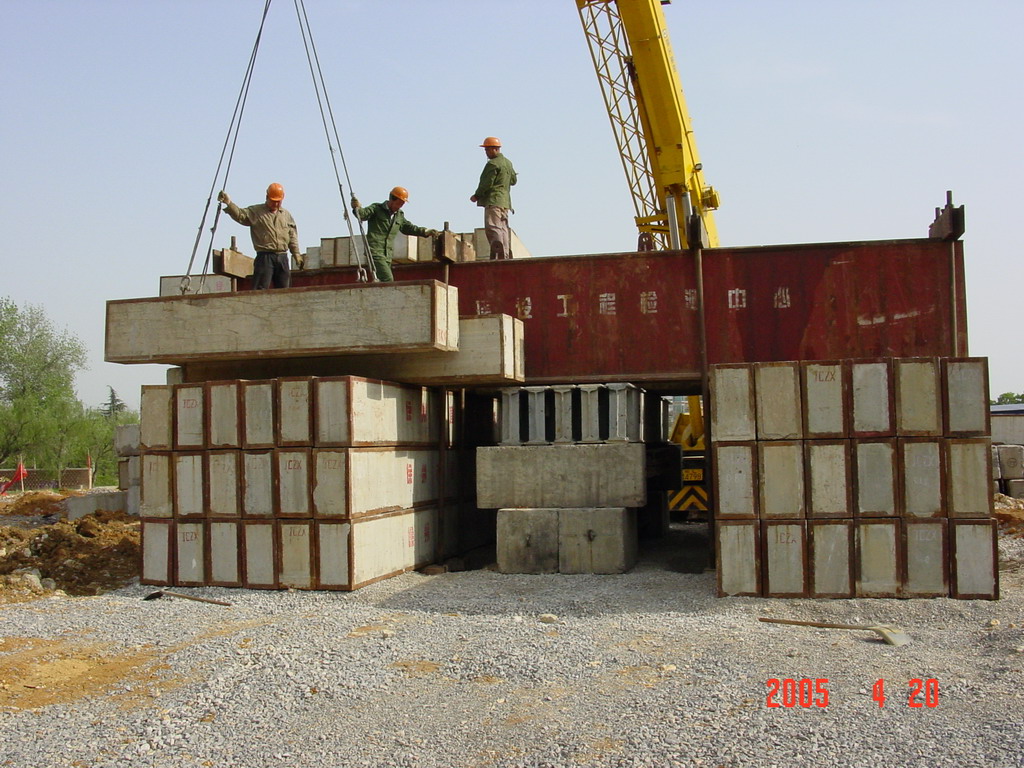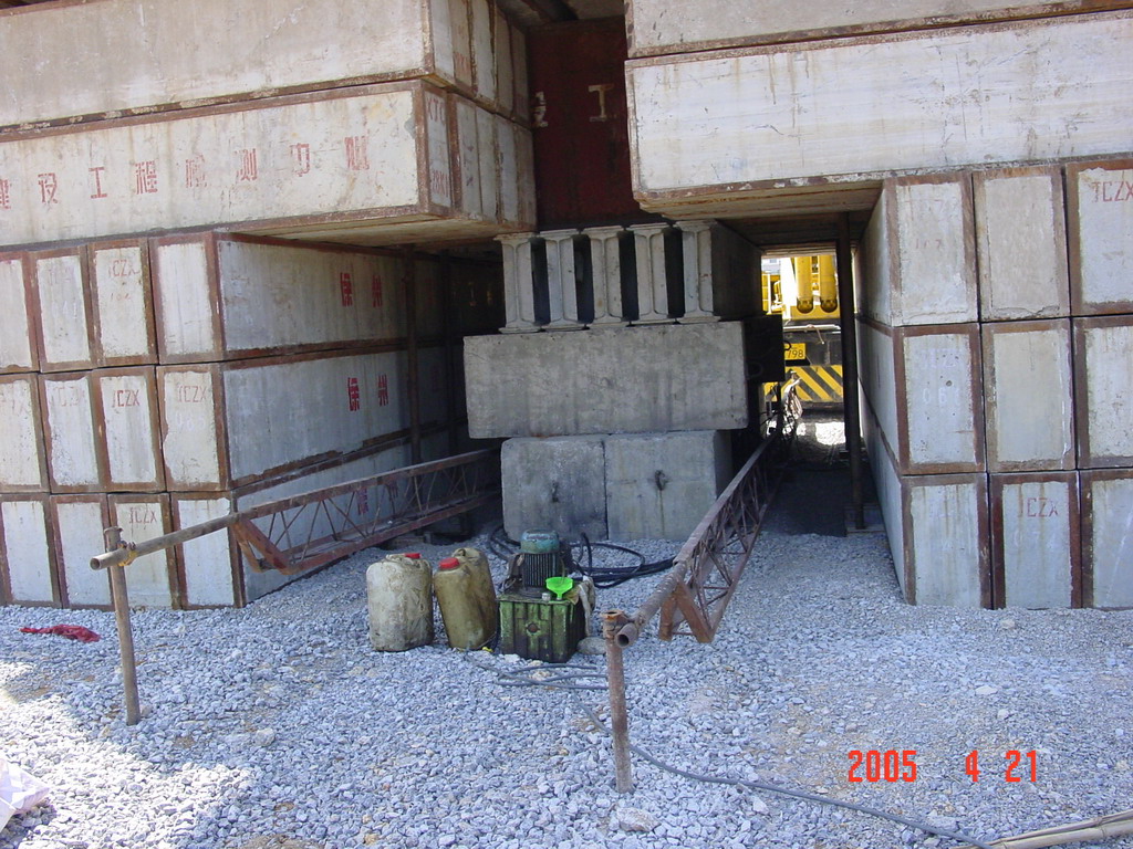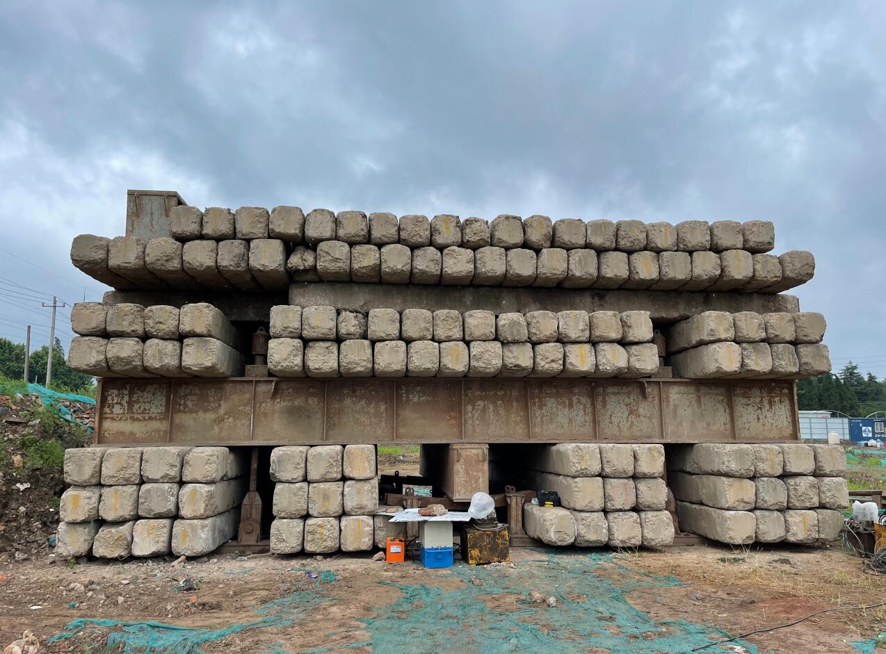 靜載荷試驗采用壓重平臺反力裝置。該裝置主要由箱形鋼梁和預制鋼筋混凝土壓重塊組成,并通過拉桿連接,充分利用了支墩的重力。總反力為18750KN。