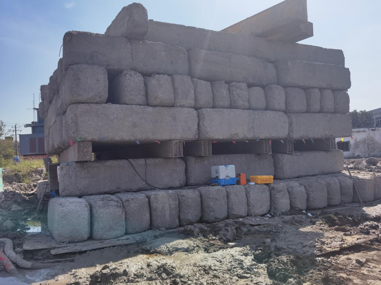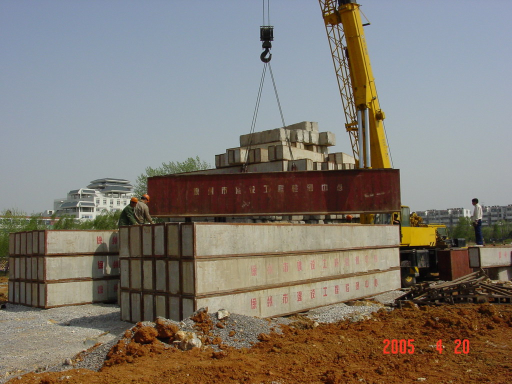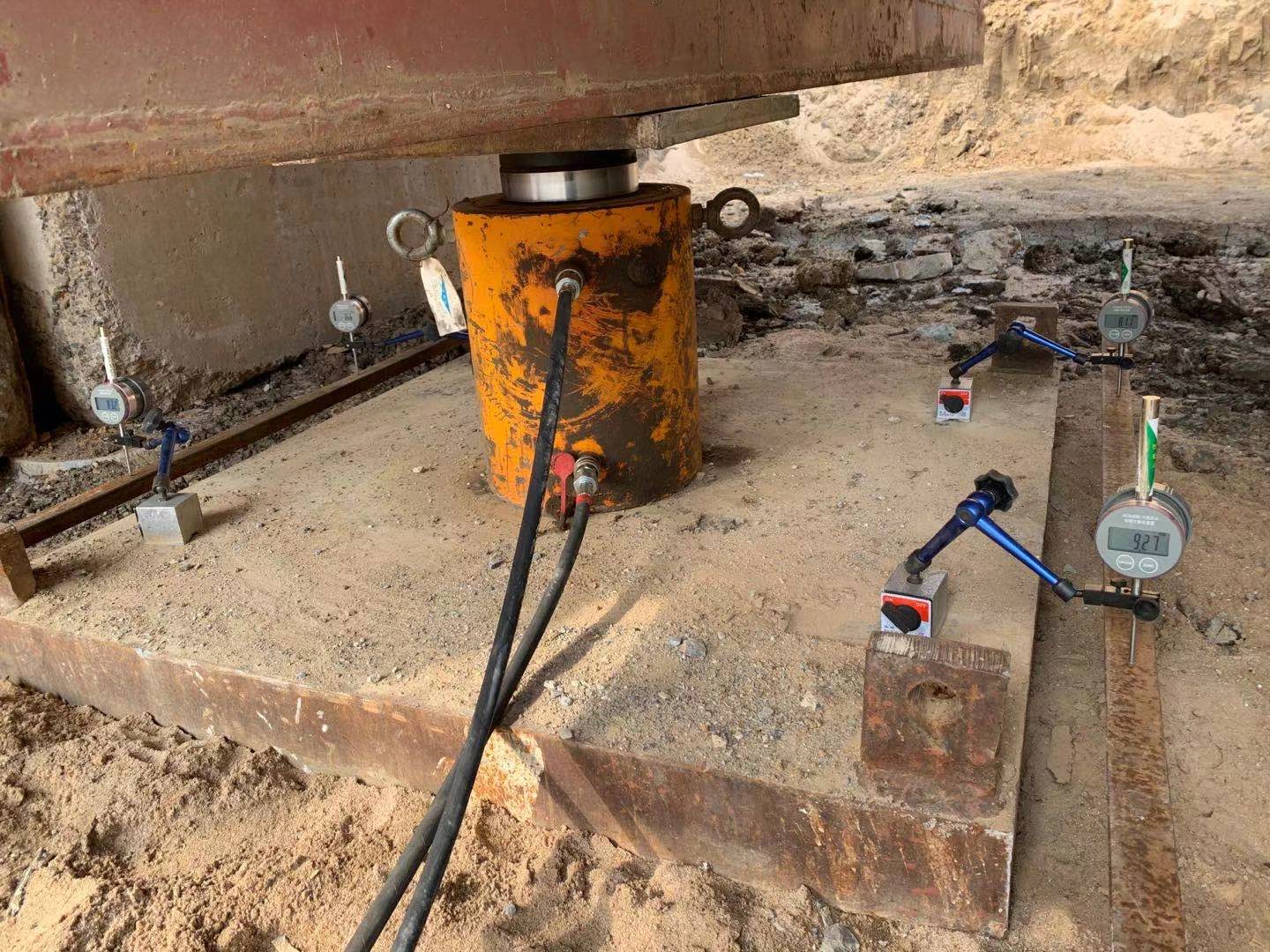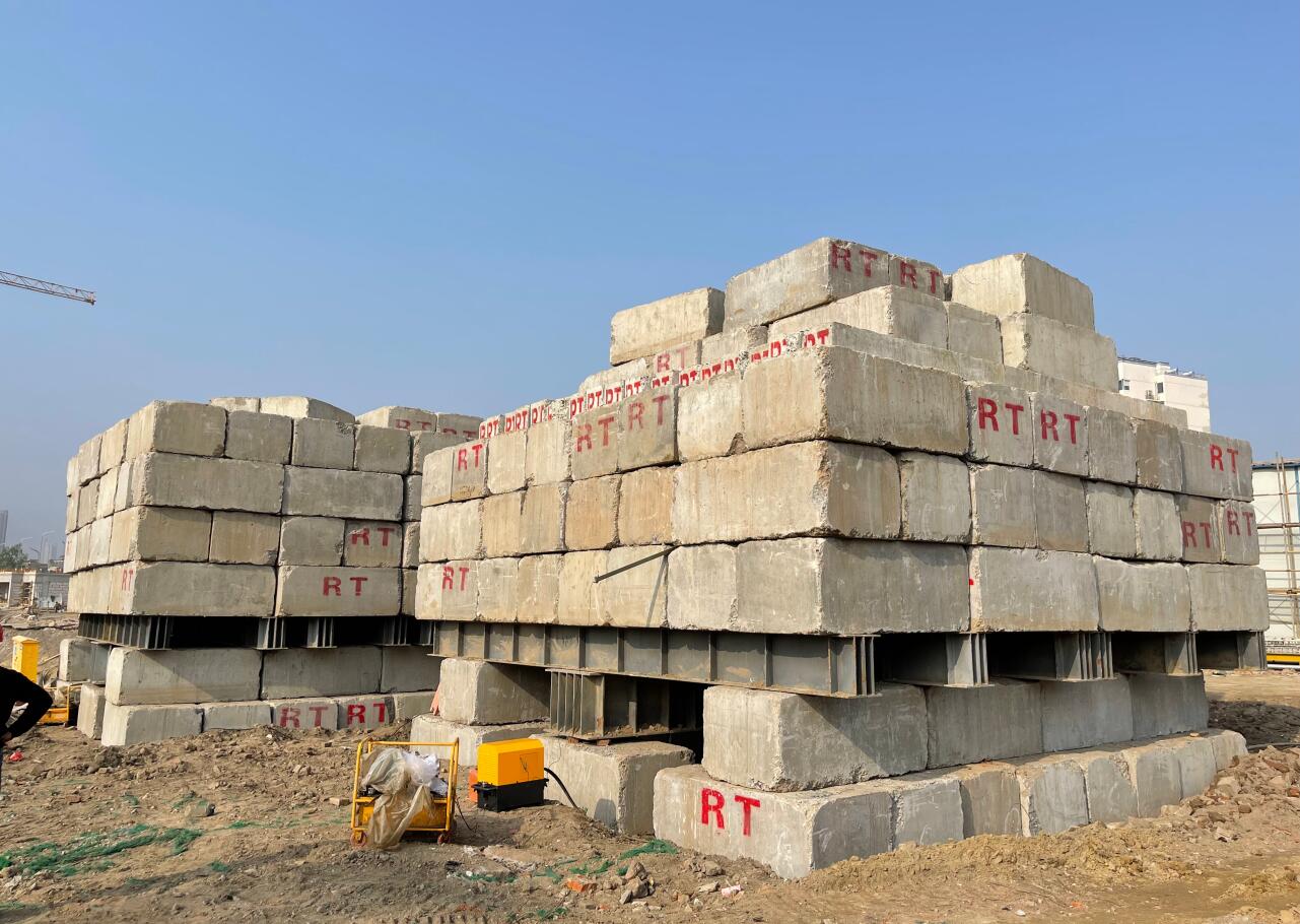 靜載荷試驗采用壓重平臺反力裝置。該裝置主要由箱形鋼梁和預制鋼筋混凝土壓重塊組成,并通過拉桿連接,充分利用了支墩的重力。總反力為18750KN。