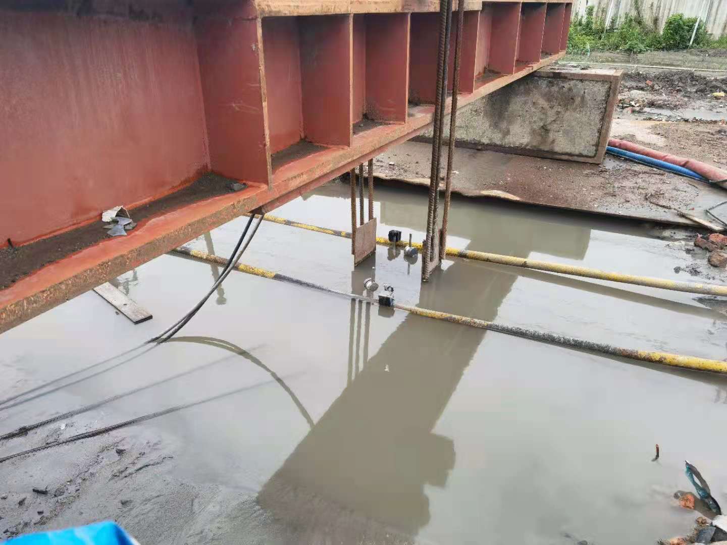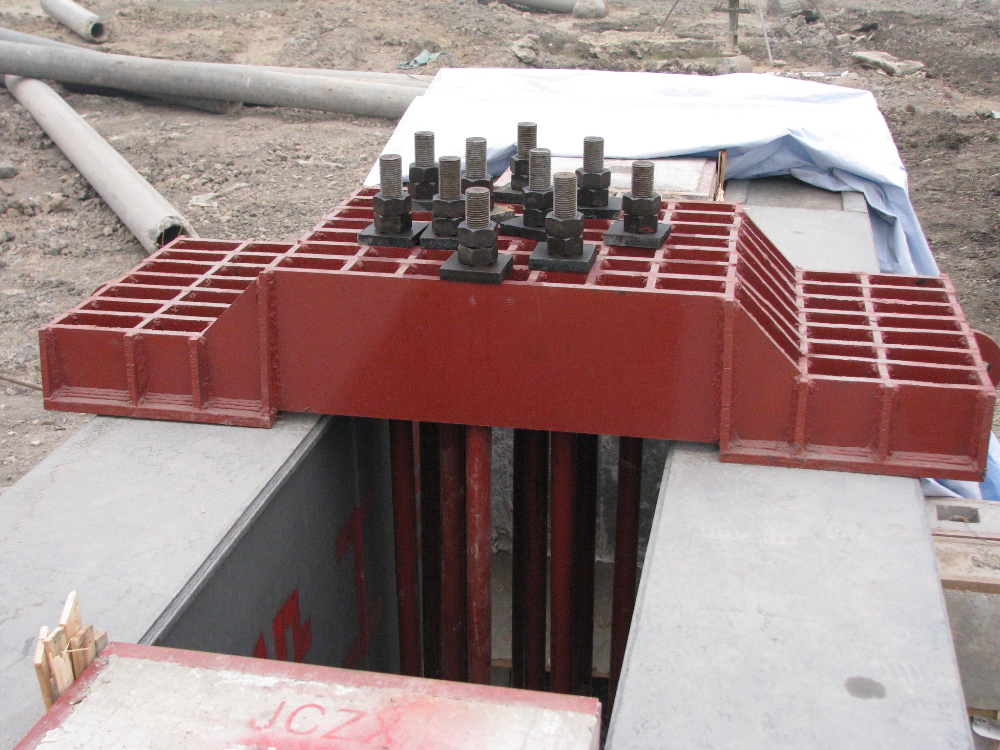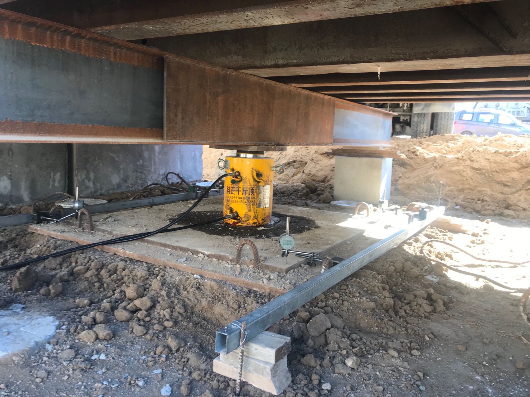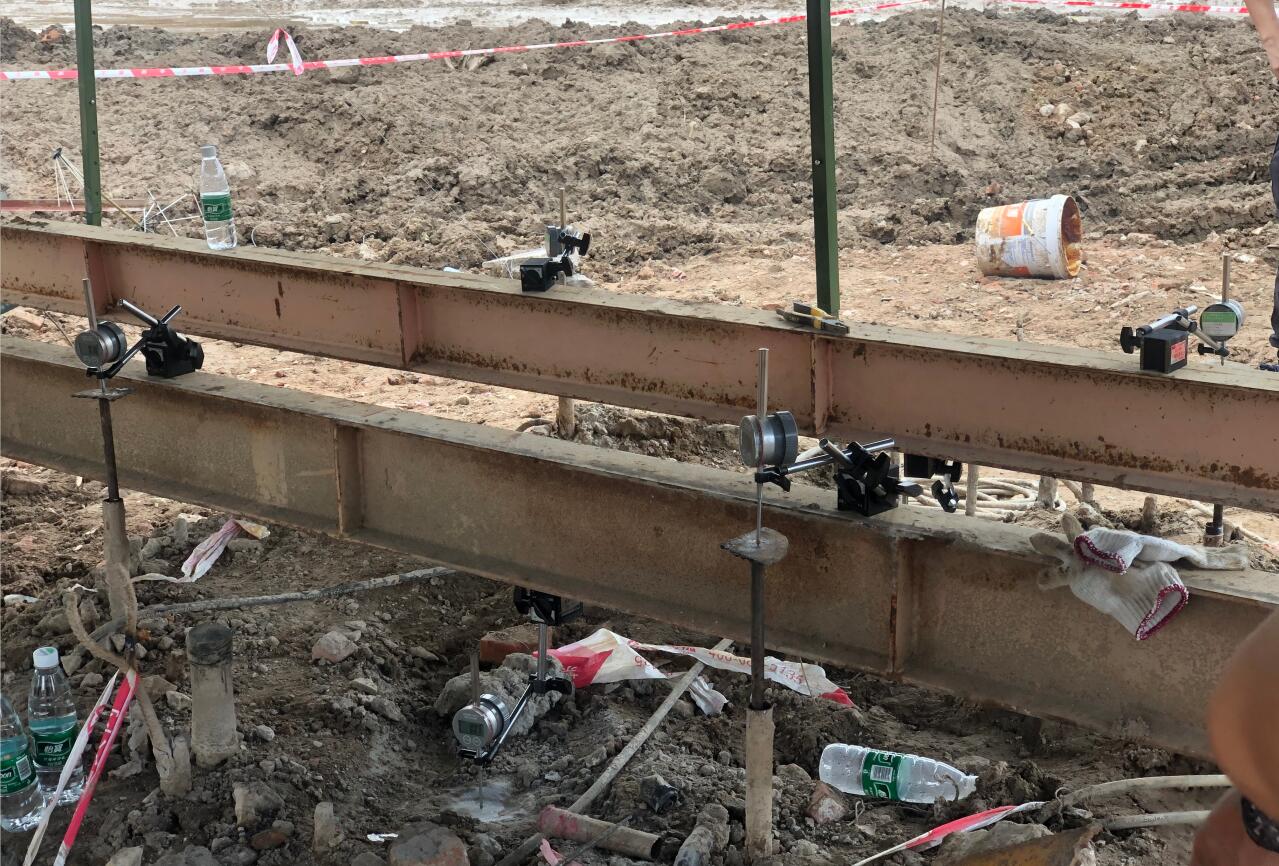 靜載荷試驗采用壓重平臺反力裝置。該裝置主要由箱形鋼梁和預制鋼筋混凝土壓重塊組成,并通過拉桿連接,充分利用了支墩的重力。總反力為18750KN。